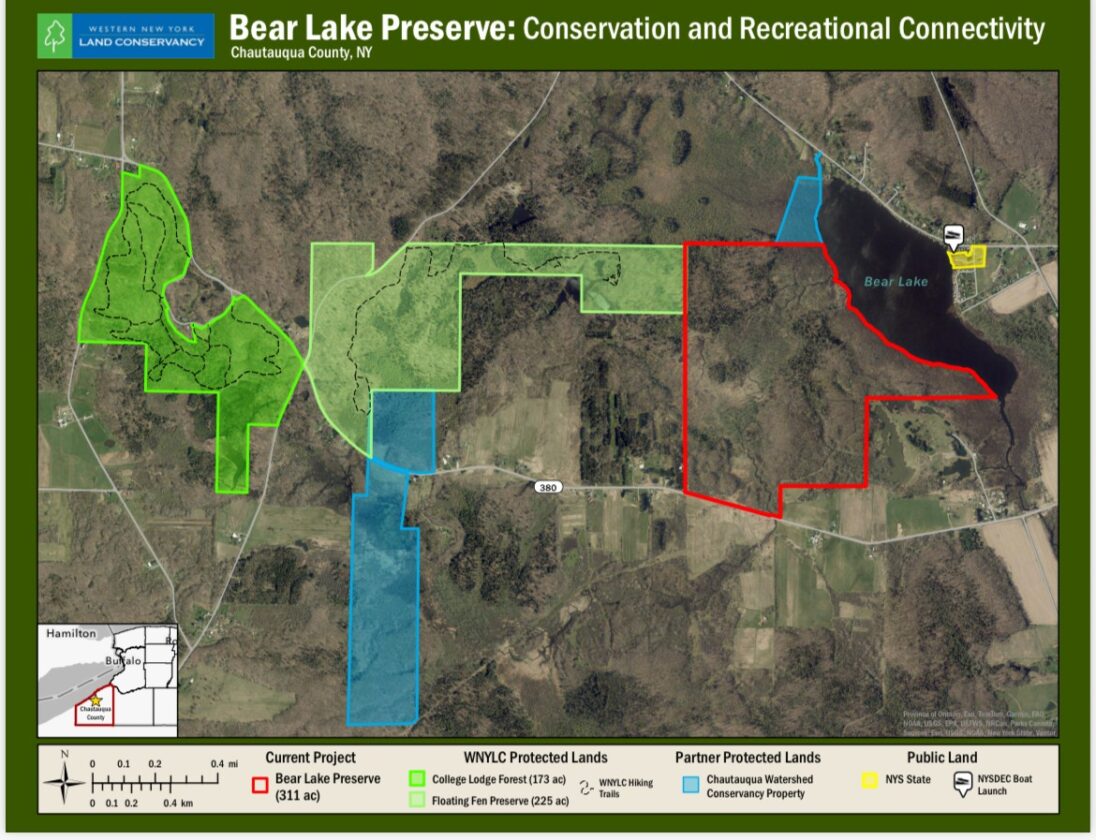 Jay Bailey, Regional Director for the Allegany Region of Office of Parks Recreation and Historic Preservation, says: “Supporting the Western New York Land Conservancy’s acquisition and protection of these lands and vulnerable natural communities around Bear Lake in Chautauqua County, while also providing for public access for outdoor recreation, is a great example of how effective the Environmental Protection Fund can be. Protecting habitats and water quality, enhancing physical connectivity between natural areas, protecting and enhancing biodiversity, and providing places for the public to experience and learn about the natural world–or just escape the everyday rigors of modern life–is a benefit to us all, and dovetails nicely with the mission of the New York State Office of Parks, Recreation, and Historic Preservation.”