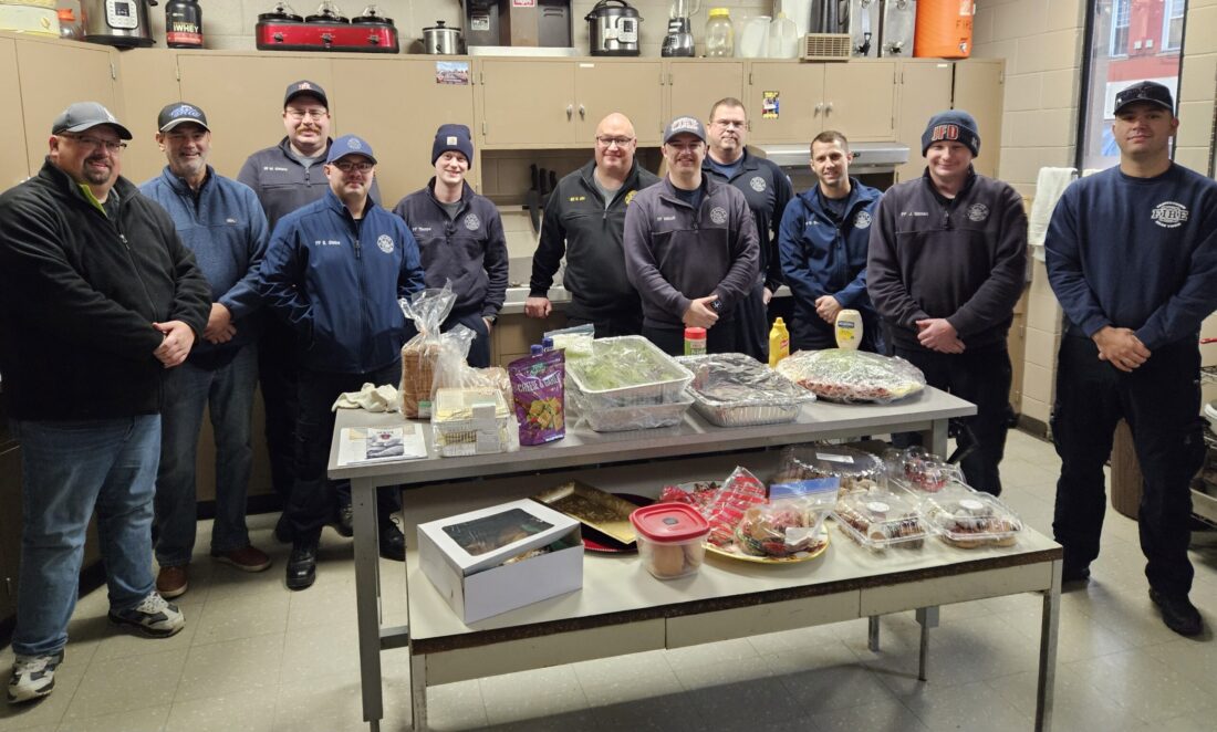 Chautauqua Eagles Aerie 2145 are pictured with Jamestown firefighters after the club prepared a Christmas meal for members of the department’s First Platoon on Christmas Day.