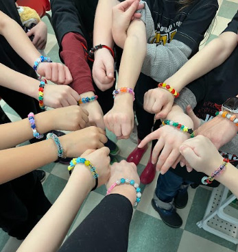 Students showing off the custom bracelets made at some of the craft stations.