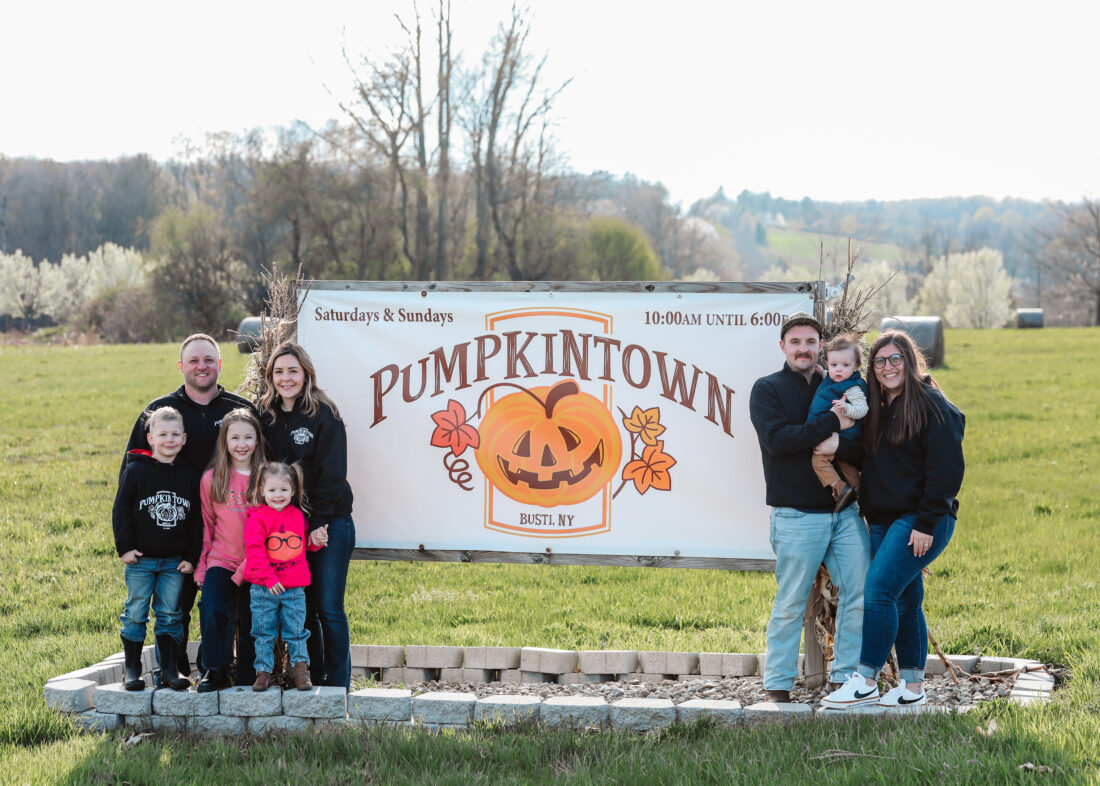 Luke and Caylee Ames and Nick and Katie Madden, and their children, are pictured outside Pumpkintown. The Ames and Madden families have purchased the Busti business and will open its gates this fall. Submitted photo