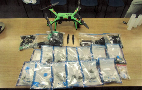 MARCY, N.Y. (AP) — A drone flew over the grounds of an upstate New York prison after midnight and released a package containing knives, a cellphone, bandannas, hair clippers and a green leafy substance between two dormitories, officials said Wednesday.