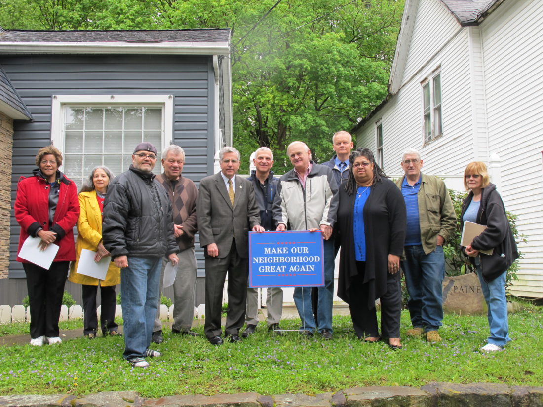 From left, Maria Jones, Ward 5 councilwoman; Marie Carrubba, Ward 4 councilwoman; Pedro Vazquez, Spring Street resident; George Spitale, At-Large councilman; Sam Teresi, Jamestown mayor; Anthony Dolce, Ward 2 councilman; Donald Paine, Spring Street resident; Tom Nelson, Ward 6 councilman; Victoria James, Ward 3 councilwoman; Ronald Reichardt, Spring Street resident; and Darlene Pangborn, Spring Street resident; with one of the “Make Our Neighborhood Great Again” signs. Paine said he has 250 signs he is willing to give to neighborhood residents who want to make their neighborhood great again. P-J photo by Dennis Phillips