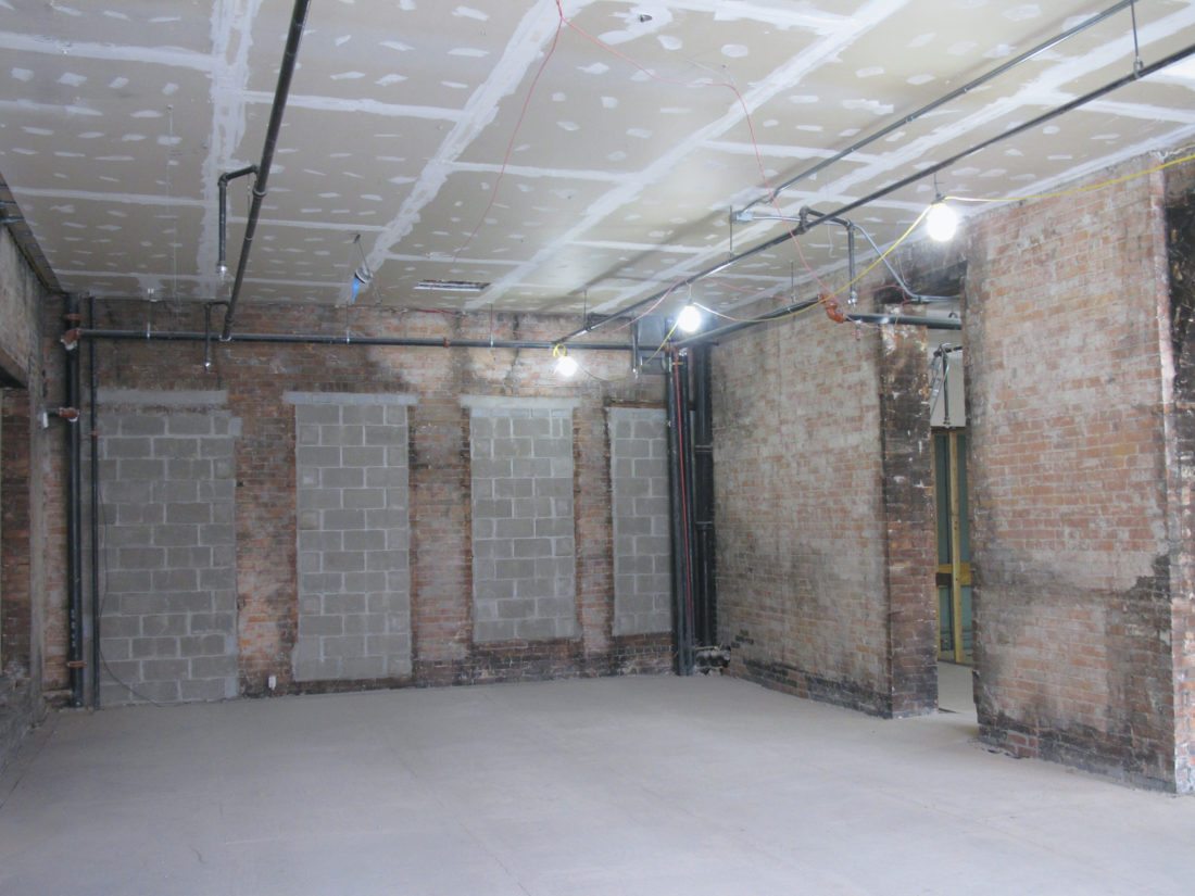 The Wright Conference Room with the drywall removed displays the original brick walls. The entire project is expected to be completed by October. P-J photo by Dennis Phillips