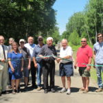 - City employees who worked on the Chadakoin Park Trail and Bike Path with, center, Russell E. Diethrick Jr., former city Parks, Recreation and Conservation Department director, and Stan Lundine, former Jamestown mayor and state Lt. Gov., during the ribbon cutting ceremony for the newly opened section of the Greater Jamestown Riverwalk. The 1.2 mile path connects West Eighth Street to Clifton Avenue, which is near D&S Glass. P-J photos by Dennis Phillips