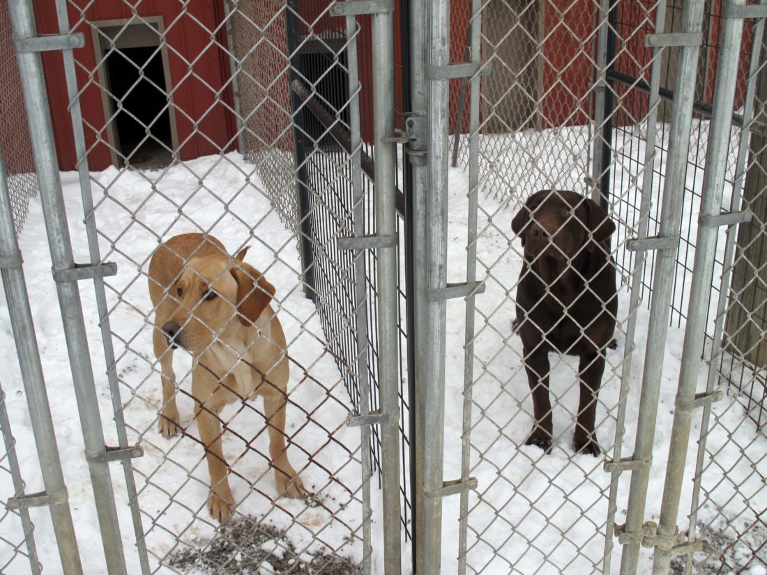 Paul Troyer recently opened Troyer’s Boarding Kennel in Clymer after purchasing pens and fencing from Happy Tails Boarding Kennel in Panama, which closed in August. Below are Candy and Coco standing in the kennel pens. P-J photos by Eric Zavinski