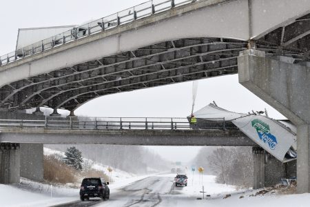 Balon said another westbound semi then struck the immobile truck, causing the trailer to disconnect and spill a portion of its load of yogurt on the road. The trailer continued over a guardrail and fell onto a westbound access ramp below, further losing its load.