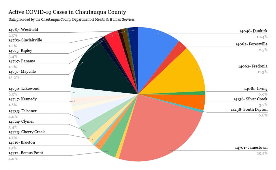 Jamestown’s 82 active cases account for 25% of the county’s active case total. Fredonia meanwhile has 37 and Dunkirk has 34 active cases as well.