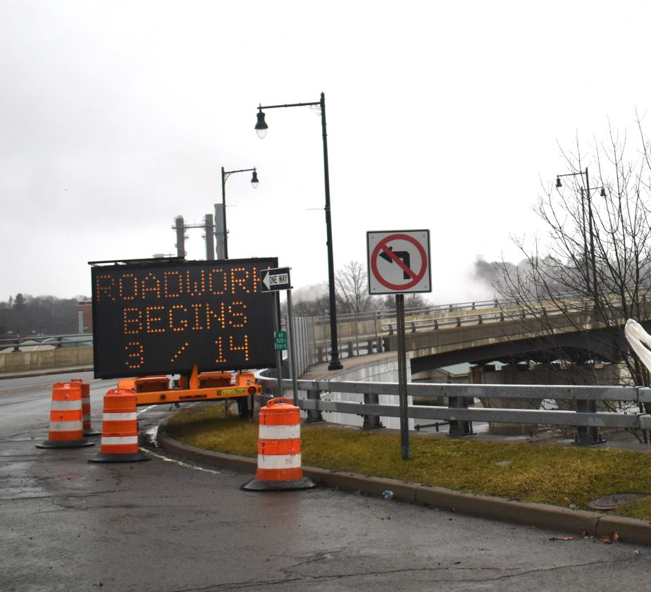 An electric sign placed in front of the Washington Street Bridge said construction work will start Monday and that motorists should expect delays.