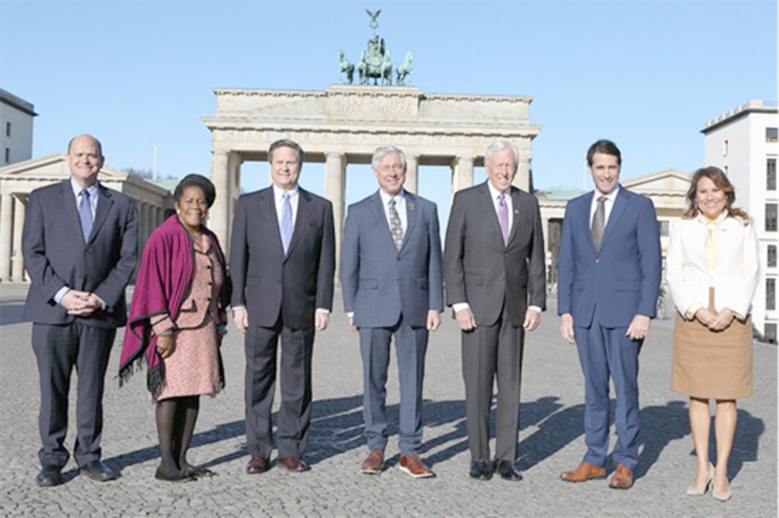 Rep. Tom Reed, left, was part of a bi-partisan delegation last week to Germany, Denmark, Poland, and Greenland. He is pictured the embassy in Berlin. Along with Reed, pictured are Majority House Leader Steny Hoyer of Maryland, Rep. Fred Upton of Michigan, Rep. Sheila Jackson Lee of Texas, Rep. Donald Norcross of New Jersey, Rep. Garret Graves of Louisiana, and Rep. Veronica Escobar of Texas. Submitted photo