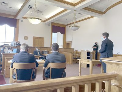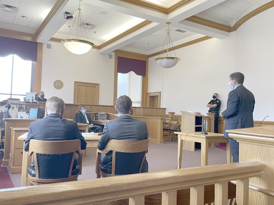 District Attorney Jason Schmidt, right, asks Judge Paul Wojtaszek to sentence Nicholas Mineweaser to the maximum, which was one year in jail, for driving while ability impaired, in an accident that took the life of 7 year old Emmaline Wilcox.