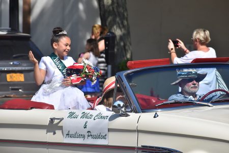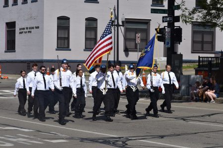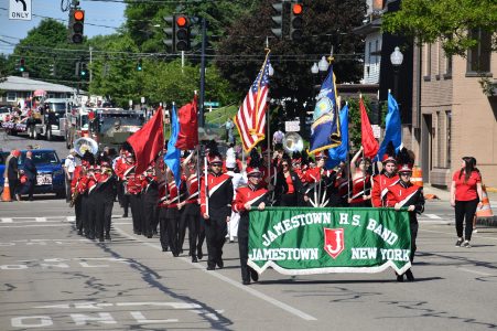 A marching band, color guard, fire trucks and, of course, veterans were present during Jamestown’s Memorial Day parade. The holiday is observed each year on the last Monday in May and is meant to mourn U.S. military personnel who have died while serving. On Monday amid beautiful weather, plenty of American flags could be seen waving by parade-goers. Among those downtown supporting local veterans were two children, Sydney and Remi Palmer of Jamestown. Both proudly waved flags as area veterans, Boy Scouts and Blue Star Mothers walked past. The parade began on West Fourth Street and continued to Buffalo Street. The day’s event, one of several honoring fallen troops held across Chautauqua County, was preceded by the Blue Star Mothers’ annual Gold Star Memorial Remembrance Saturday at Veterans Memorial Park.