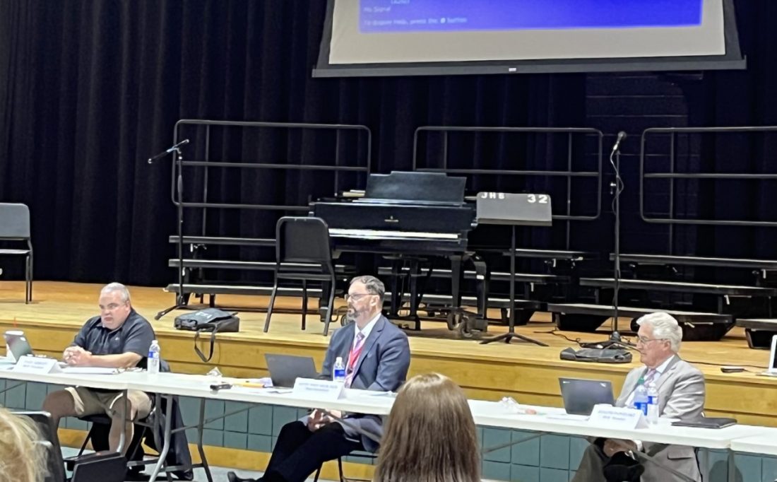 Jamestown Schools Superintendent Dr. Kevin Whitaker, middle, is pictured during Tuesday’s school board meeting. P-J photo by Eric Tichy
