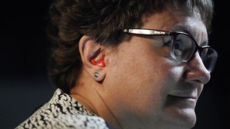 Chelle Wyatt wears her hearing aid Friday, April 15, 2022, in Salt Lake City. People with hearing loss have adopted technology to navigate the world, especially as hearing aids are expensive and inaccessible to many. AP photo
