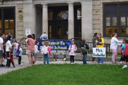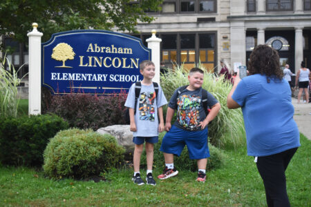 Students gather outside the front door of Abraham Lincoln Elementary School, 301 Front St., on the first day of school, Tuesday.