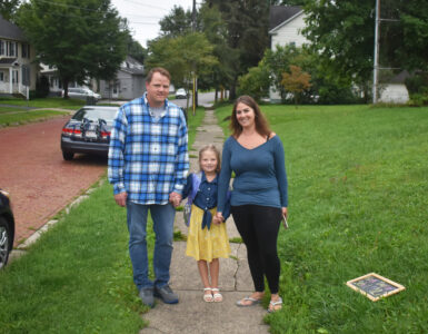 Aimee and Matthew Swanson stand with their daughter Isabella, on the way to Abraham Lincoln Elementary School, 301 Front St., Tuesday.