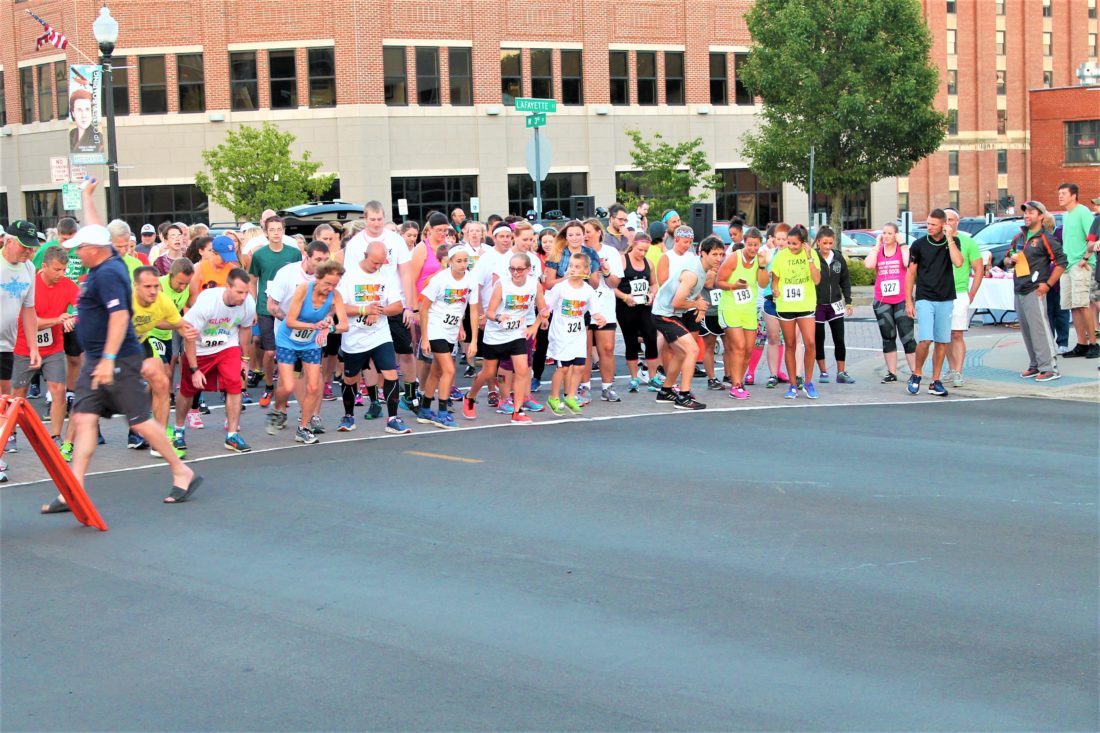 Runners set off on the Glow Your Mind 5K Saturday evening in downtown Jamestown. More than 100 runners and walkers participated in the event. P-J photo by Jordan W. Patterson