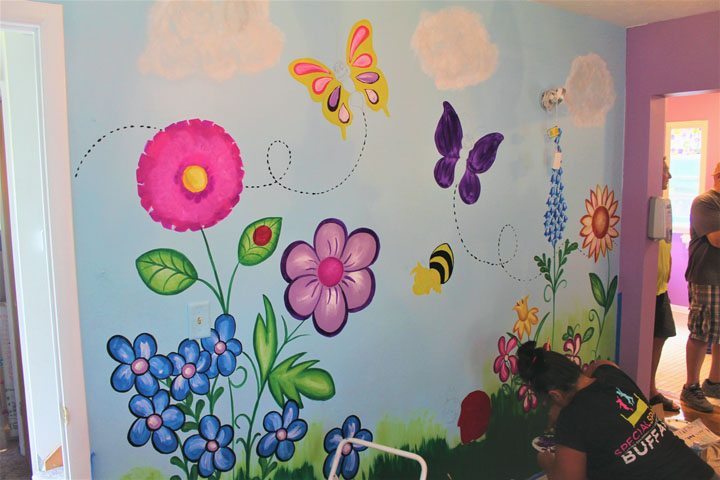 Usually, Special Spaces Buffalo lets the child choose a theme for their new room. In this case, because of her conditions, Goins is non-verbal and wasn’t able to choose a theme. Previously, her room had a color scheme of purple and featured butterflies, so the design team expanded on that theme and painted a giant mural on one wall in her room.