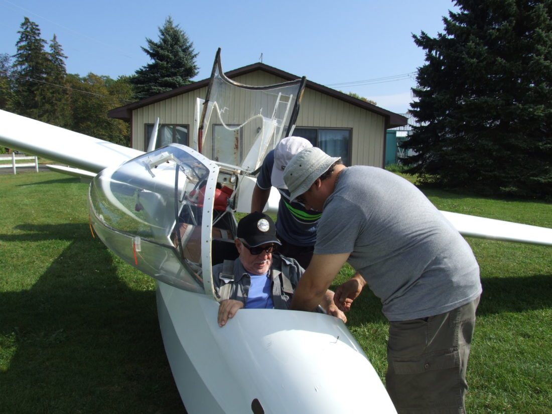 Dr. Galo Grijalva secures Fred Rowland before a glider ride at Aero Soaring Club located at Dart Field, Mayville, New York. Photos by Beverly Kehe-Rowland