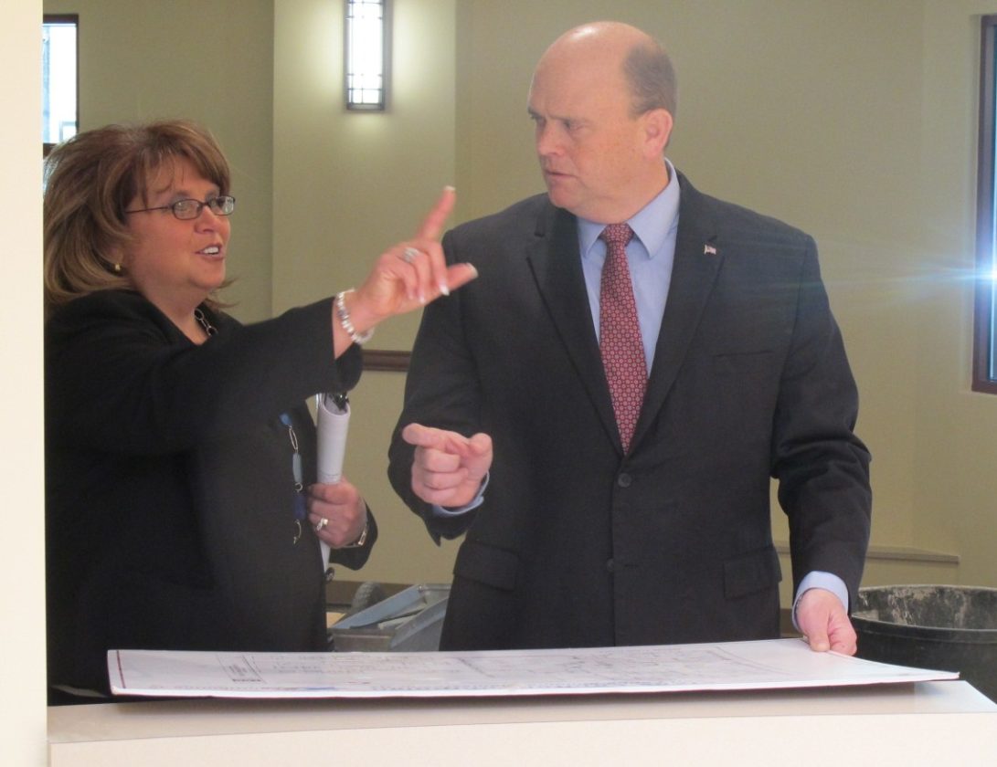 Heather Brown and Rep. Tom Reed, R-Corning, discusses renovations to The Resource Center Carl Cappa Building. P-J photo by Dennis Phillips