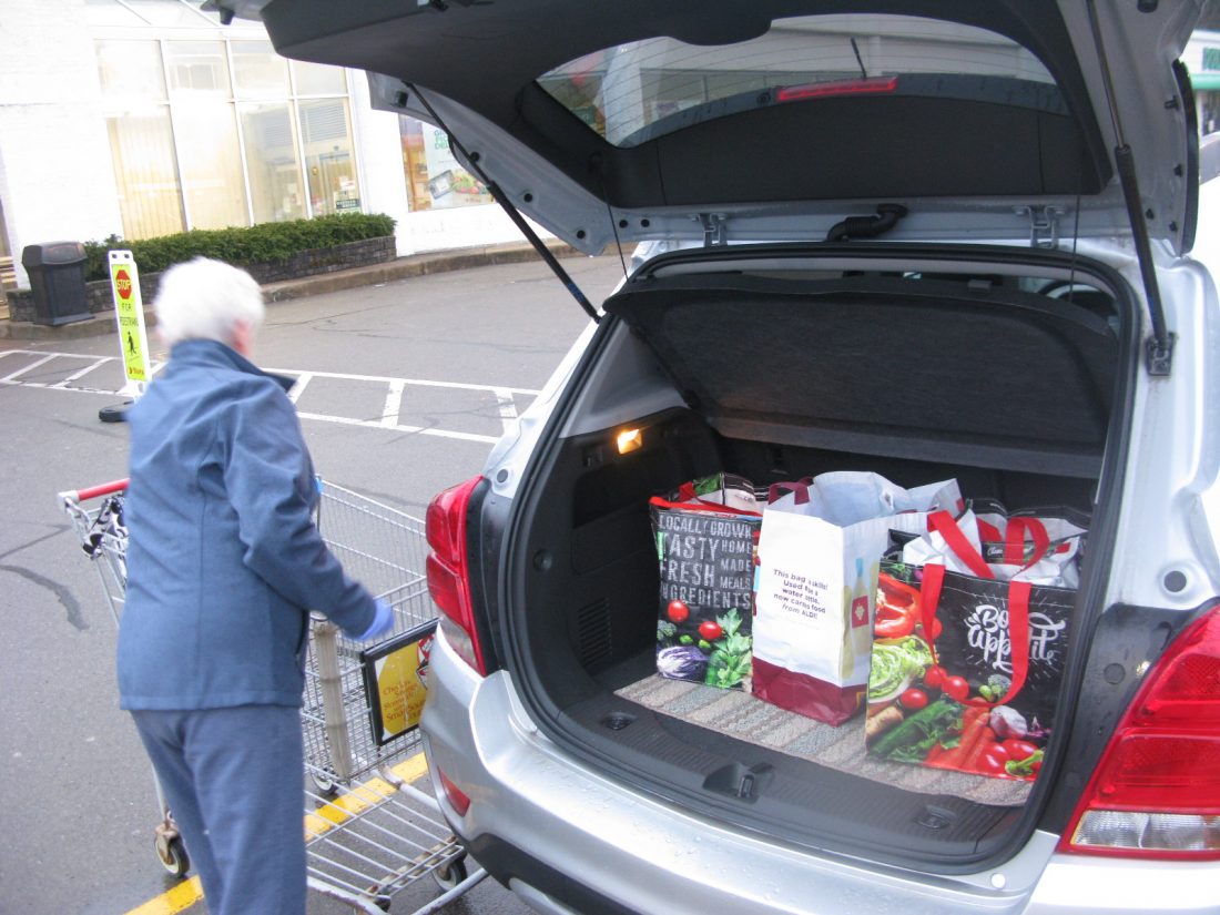 Bemus Point resident Joan Miller is pictured Thursday morning putting groceries in her car after shopping at Tops Markets in Jamestown. Miller said she’s glad stores are allowing seniors to shop by themselves and feels better knowing she has staple items at home. P-J photo by Eric Tichy