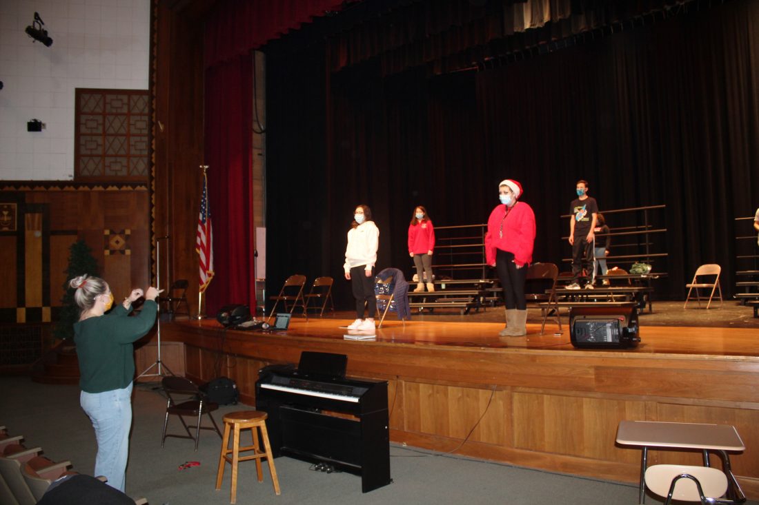 Lauren Scharf directs the JHS A Cappella Choir Madrigal Singers socially distanced in the high school auditorium on Wednesday afternoon. The choir will present five pieces in a virtual concert that will be available on the Jamestown Public Schools’ website on Dec. 21. P-J photos by Cameron Hurst