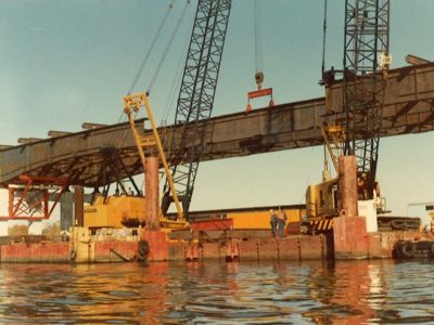 “When the girders and bracing arrived from High Steel on the Stow side, we would use a landside crane to load the steel onto a working barge,” LaRose said. “The working tugboat would then push it out on the lake to the erection position. The large crane would hoist the girder into place, and I would be up on the bridge with my surveying level to verify the position. Then the bolting would begin. The smaller barge-mounted crane would erect the connecting frames and other steel used between the girders to keep everything solidly braced.”