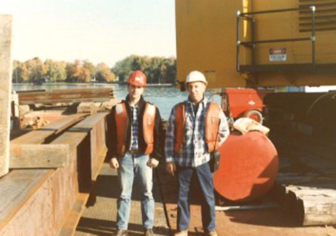Jim LaRose, then the field engineer and timekeeper, and Billy Crane, structural erection supervisor, are pictured during the construction of the Chautauqua Lake bridge in 1981. The bridge is nearing its 40th birthday. Photos by Jim LaRose