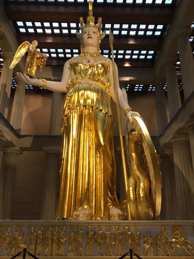 Who knew Nashville had a full-scale replica of the Parthenon, built in 438 BC in Athens, Greece? Fred Rowland did and he insisted he take me there. The original was built in 1897 as one of the Tennessee Centennial Exposition’s temporary buildings. The reason could have been because Nashville was once called “The Athens of the South.” The first Parthenon was not constructed to last indefinitely and was replaced after it became weathered. The new one was rebuilt out of concrete, stone and brick, which took 11 years and one million dollars. It was restored for 12 times the original cost from 1991 to 2001. Inside the structure are art galleries. In 1990 a white 42-foot statue of Athena was added, again full-scale to the one found in Greece. The statue was gilded in gold in 2002.