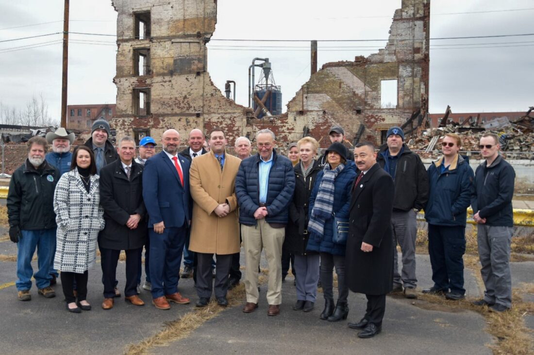 - Pictured is U.S. Sen. Charles Schumer, along with both city and county officials across the street from the former Crawford Furniture Factory, which was consumed in a massive fire in November. Submitted photo