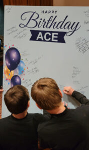 - From left, Ethan Ecklof, 9, and his brother Jacob, 12, sign a birthday card that was presented to Ace Frehley. Photo by Chad Ecklof