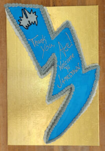Pictured is the lightning bolt cake that was presented to Ace Frehley. It was a marble cake with custard and raspberry filling, and blue icing outlined in silver to pay homage to Frehley’s makeup when he was in KISS. Photo by Chad Ecklof