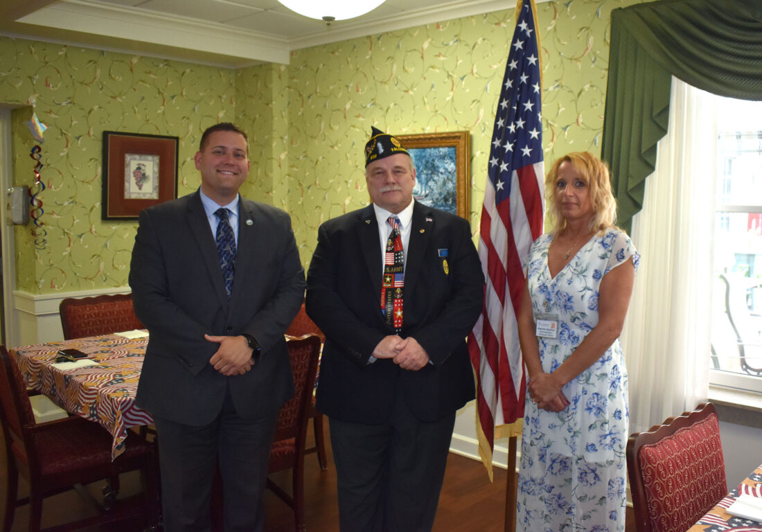 Jamestown Mayor Eddie Sundquist; Steve Cybart, county commander and with the Henry Mosher Post 638 American Legion; and Shannon Anzalone, administrator at Holtquist Place, are pictured Wednesday. P-J photo by Eric Tichy