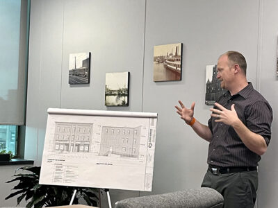 Chris Cooke, project architect, provided updated site plans for 106 Fairmount Ave., located on the corner of Fairmount and West Eighth Street in Jamestown. The building is probably best known as the former home to Joyce’s Keg Room and the bands that played there, though it has largely sat vacant over the years.