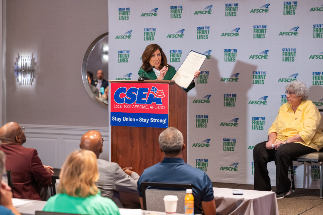 Gov. Kathy Hochul is pictured with legislation expanding civil service opportunities. Legislation Hochul signed in 2022 requiring employers to provide pay ranges in all advertisements for new hiring or promotions went into effect this week.