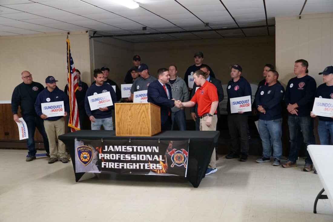 Union members of the Jamestown Fire Department officially threw their support behind incumbent Mayor Eddie Sundquist during a live-streamed press conference Wednesday.