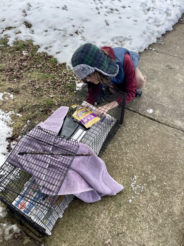 Finn Laska sets up a humane trap to help trap feral, stray and community cats to help take care of them by getting them to the vet and spayed or neutered.