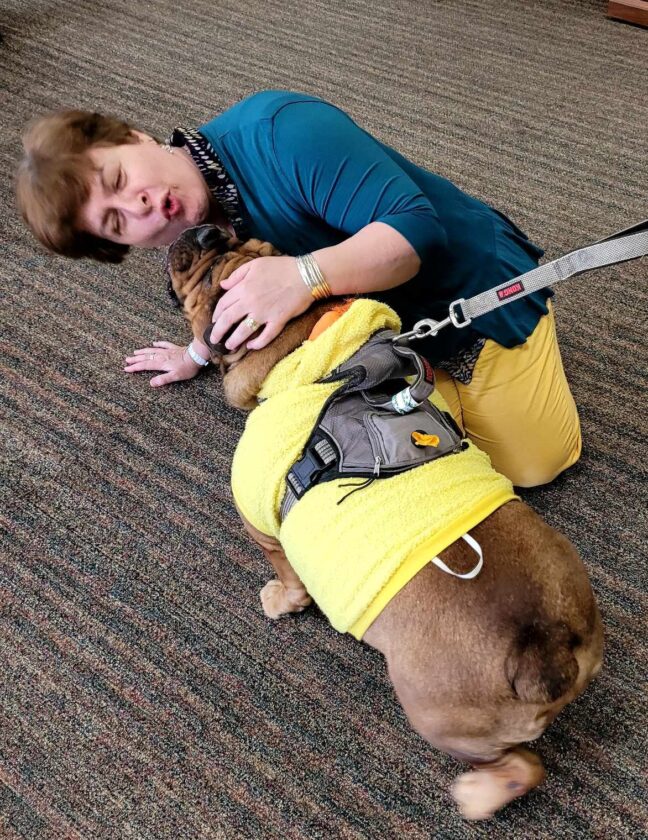 Clarence, an Old English Bulldog stops to give some love to Mala Reichard, a human resources specialist at Tanglewood Manor, native of South Africa and resident of Jamestown, during his visit to Tanglewood Manor and Memory Gardens, recently. P-J Photos by Christopher Blakeslee