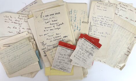 Spiral notebooks of creative material from the Stiller & Meara Archive are pictured.