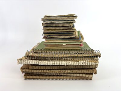 - Spiral notebooks of creative material from the Stiller & Meara Archive are pictured.