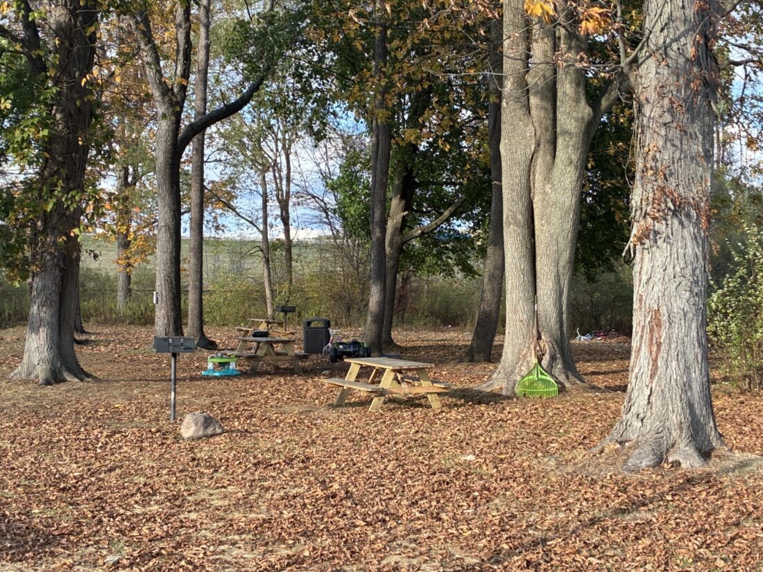 The outdoor area of the hotel, with picnic tables and grills for hotel guests.