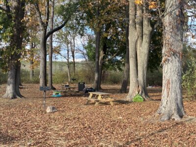 - The outdoor area of the hotel, with picnic tables and grills for hotel guests.