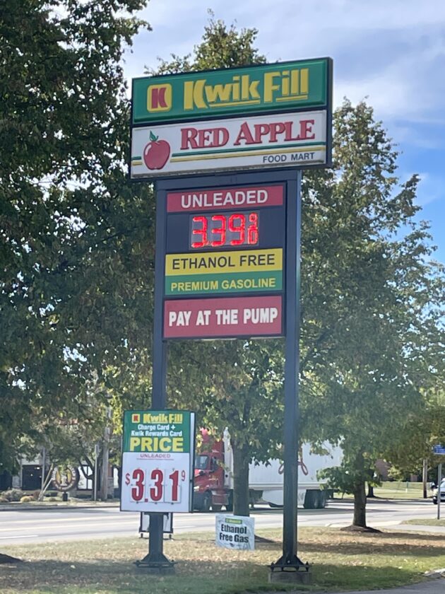 Gas prices stuck at $3.399 a gallon are pictured in Lakewood on Thursday. P-J photo by John Whittaker
