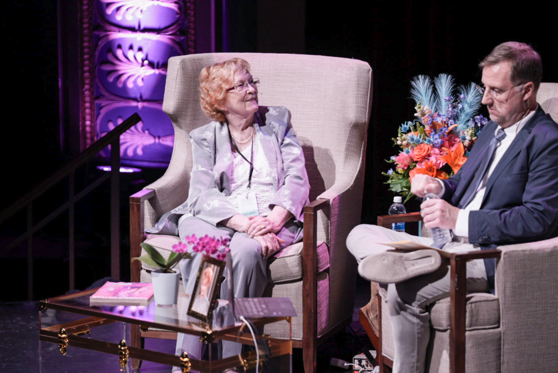 Wanda Clark is pictured before a discussion with Ric Wyman, Lucille Ball historian and author, during her final visit to Jamestown in 2024.