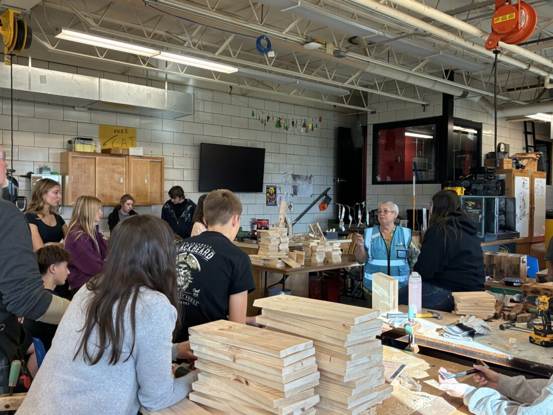 Elaine Crossley informs students about bluebird habits before they work on constructing the bluebird houses.