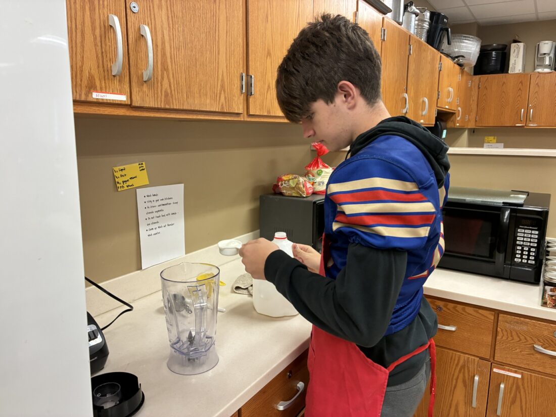 - A student hard at work measuring out ingredients for a smoothie.