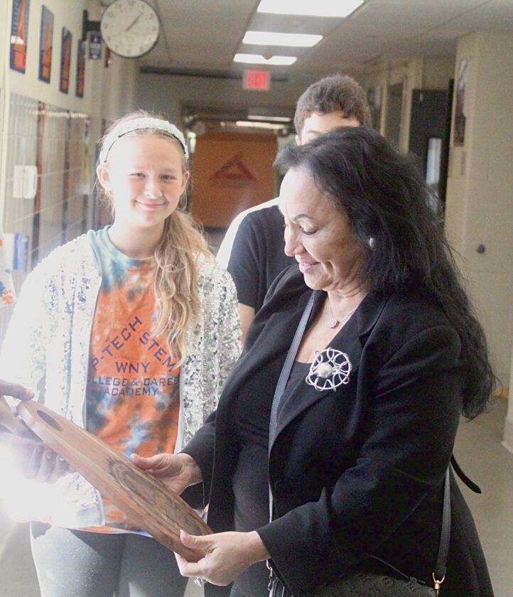 Myah Benjamin, a WNY P-TECH student in Dunkirk, looks on as State Education Department Commissioner Dr. Betty Rosa receives a custom charcuterie board gifted to her on a tour of the campus earlier this week. Rosa later described Benjamin as her “shero.”