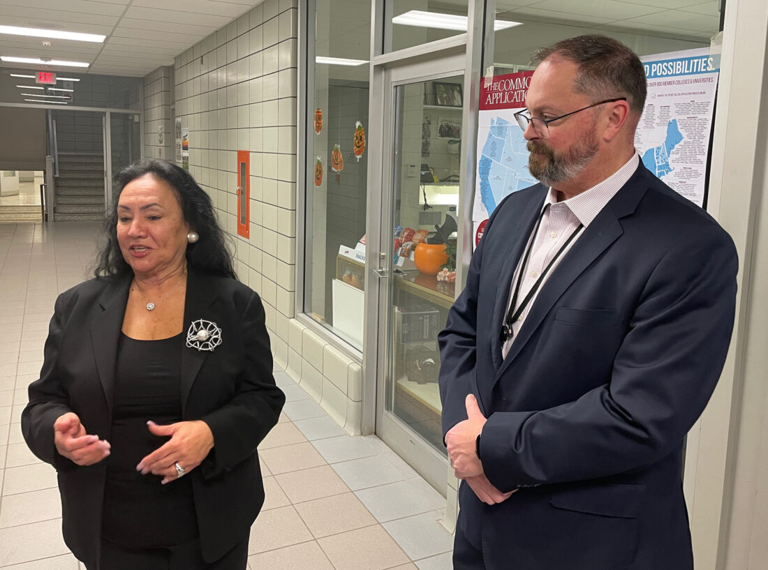 From left, State Education Commissioner Betty A. Rosa, and Jamestown Public Schools Superintendent Dr. Kevin Whitaker talk outside the school store Wednesday at Jamestown High School. P-J photo by Michael Zabrodsky