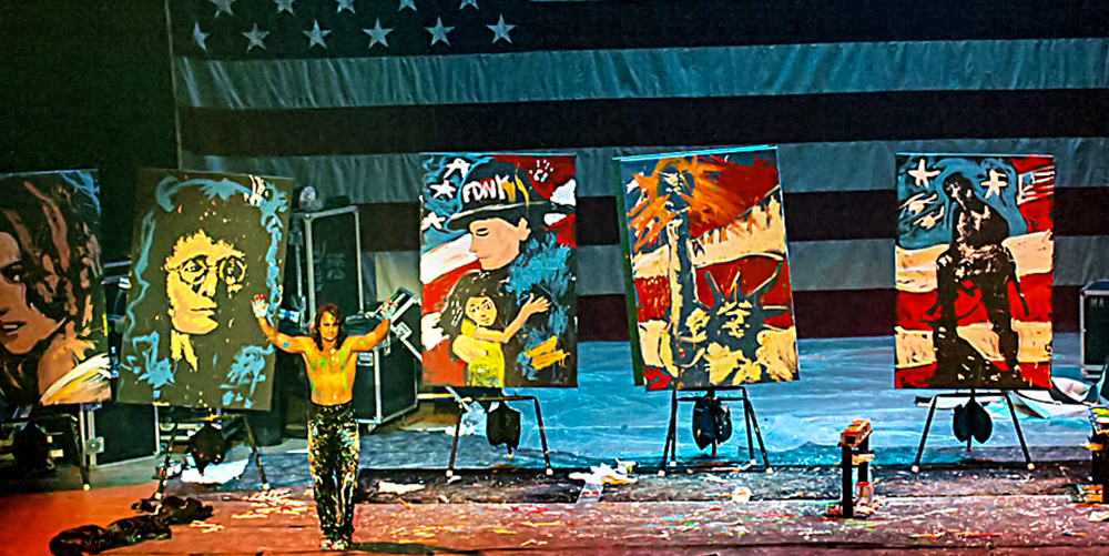 - Israel posing on stage with numerous patriot paintings that he had completed moments before.