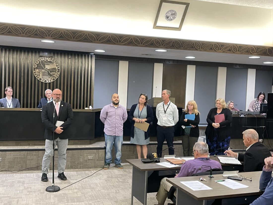 Chautauqua County Executive PJ Wendel speaks at the Chautauqua County Legislature as various Social Service leaders look on.