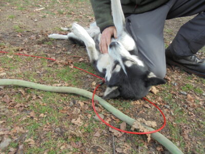 The other adult husky that Constantino currently has in his kennel gets a belly rub. P-J photo by Sara Holthouse
